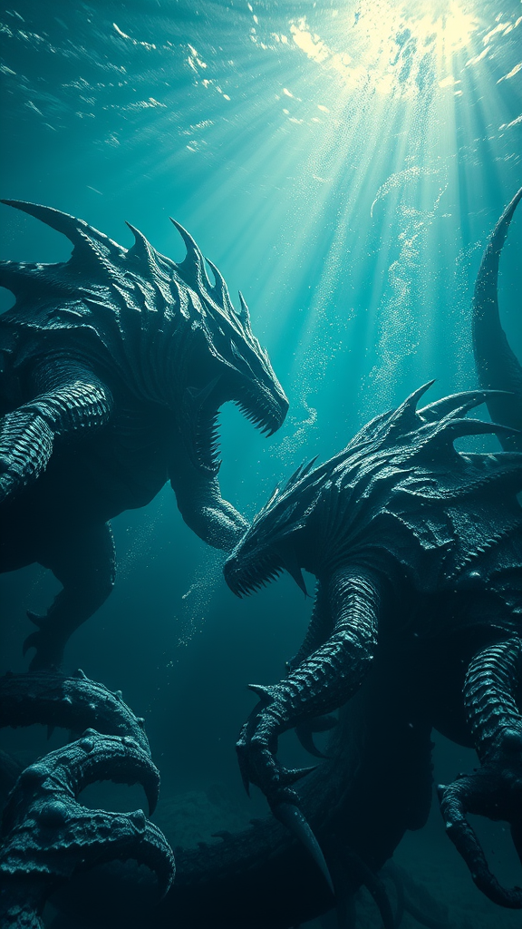 Two colossal sea monsters engage in an epic underwater battle, fueled by power and intense rage, surrounded by the shadowy depths of the ocean. An expansive deep-sea background sets the scene with intricate occlusion and an epic wide shot, capturing the aerial perspective. The scene exudes a dark fantasy vibe, reminiscent of the styles of League of Legends and Sea of Thieves, realized in stunning CGI. Depth focus highlights the intricate details of the battle, accented by crepuscular rays breaking through the water, creating a photorealistic atmosphere. The image is hyperrealistic and deeply detailed, with a complex and maximalist design, bringing the intense and dynamic underwater confrontation to life.