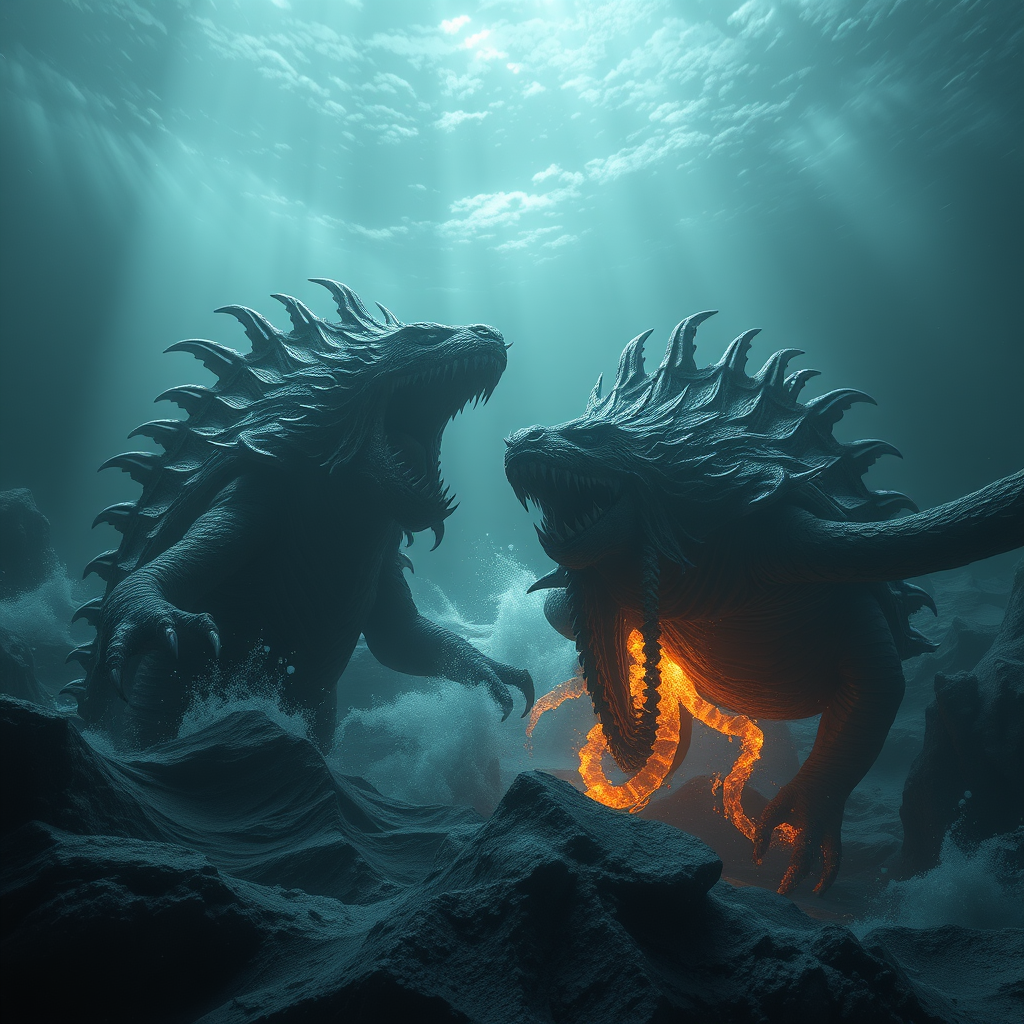 Two colossal sea monsters locked in an epic battle beneath the waves, their powerful forms radiating rage and anger in the deep sea depths. The scene unfolds deep underwater with an ominous backdrop, where light struggles to penetrate, creating dramatic occlusion effects. Captured in an epic wide shot with an aerial perspective, the environment evokes a dark fantasy ambiance reminiscent of League of Legends and Sea of Thieves styles. Crafted with CGI, the scene boasts incredible depth of focus, with crepuscular rays piercing the water to illuminate the rumbling chaos. The composition is photorealistic, showcasing a realistic and intricately detailed portrayal with hyperrealistic textures. The design embodies a complex and maximalist aesthetic, capturing a moment of intense conflict and wild fury.