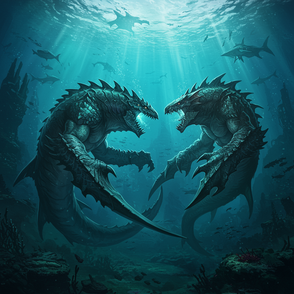 Two colossal underwater creatures locked in an epic battle, their powerful rage and anger evident in every move. Set in the depths of the ocean, the scene features a deep underwater background teeming with aquatic life and mysterious shadows. The perspective is an epic wide shot with an aerial view, capturing the full scale of the clash. Elements of dark fantasy are woven into the scenery, reminiscent of League of Legends and Sea of Thieves styles. The image employs cutting-edge CGI with a focus on depth and detail. Crepuscular rays pierce the water, creating a dramatic and photorealistic effect. The hyperrealistic depiction emphasizes intricate textures and complicated maximalist designs, offering an immersive and breathtaking view of this legendary encounter.