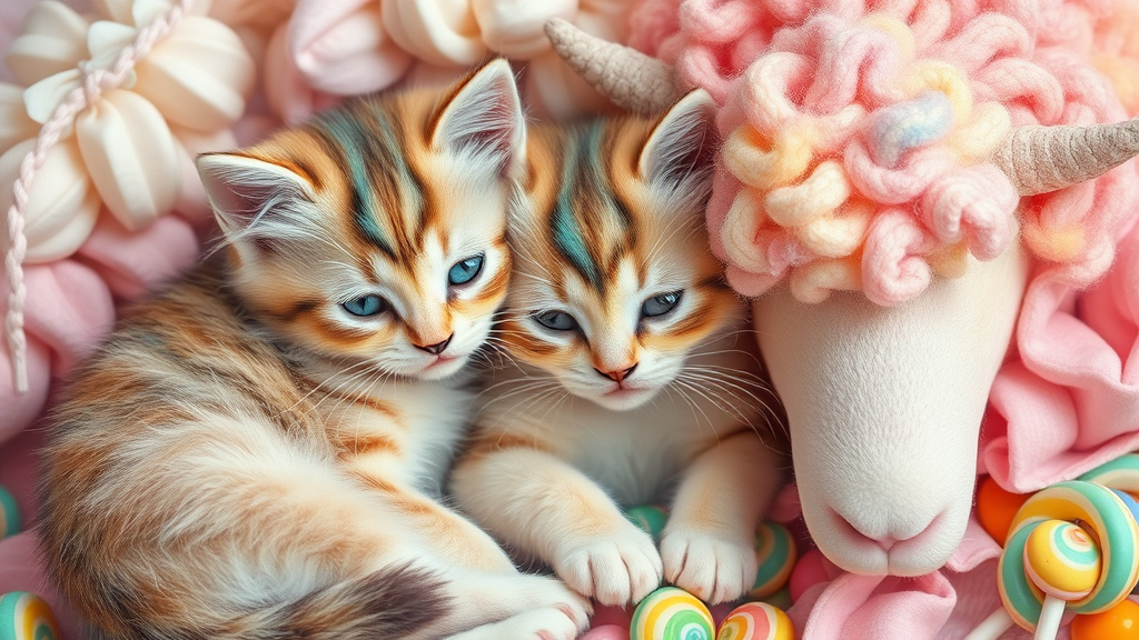 Two cuddly kittens nestled together, their fur an intricate dance of pastel hues, reminiscent of a Christen Kobke masterpiece. They are surrounded by a whimsical world where rococo charm meets the vibrant allure of a rainbow sheep, its wool resembling twirled strands of cotton candy. The scene is fantastically sweetened with elements that look as though crafted from candy and lollipops, blending nature's innocence with a sugar-coated dreamscape.