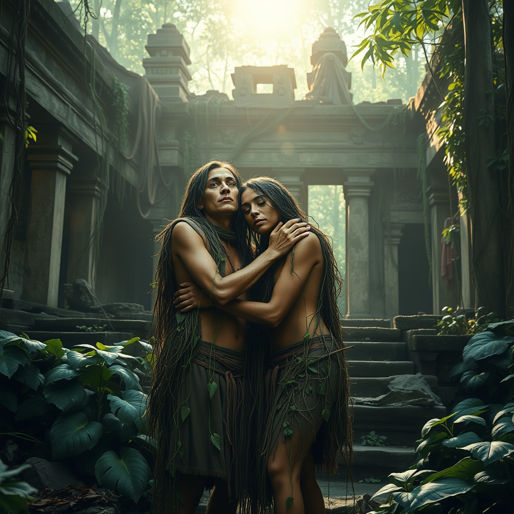 Two deceased scouts, vine-covered from head to foot, embracing each other amidst the ruins of a sacred jungle temple, with light reflections dancing across their tranquil faces.