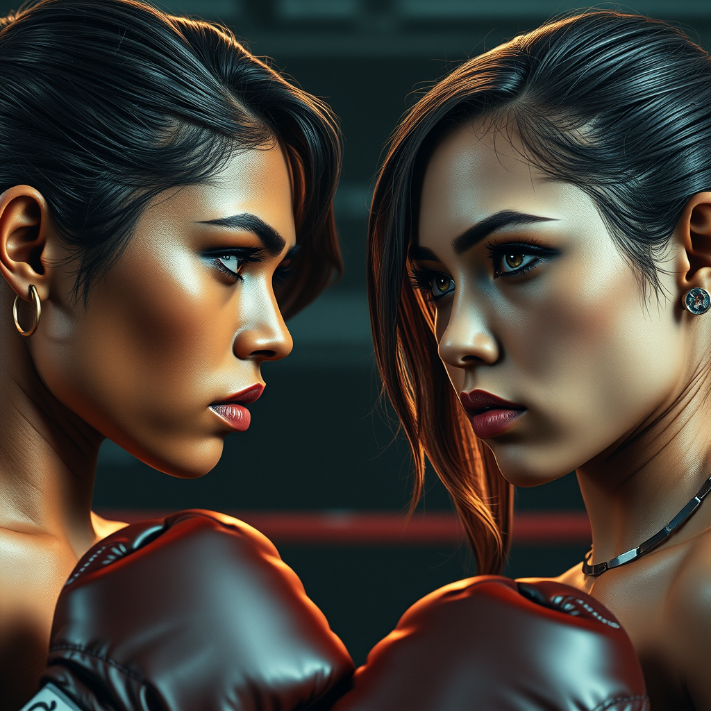 Two determined females on a boxing poster, facing off with intense expressions, captured in a detailed and realistic photographic style. The full-length frame showcases highly detailed skin in vibrant 8k resolution. The artwork is rendered in High detail RAW color, utilizing diffused soft lighting and a shallow depth of field for a sharp, hyperrealistic focus. Cinematic CGI lighting enhances the scene, presented in 3D. Despite a low resolution feel with text errors and cropping, the image intentionally incorporates visual imperfections like jpeg artifacts and minor duplications, creating a sense of raw and gritty energy. The characters are perfectly proportioned, avoiding mutations or distortion, with attention to accurate anatomy and expressions.