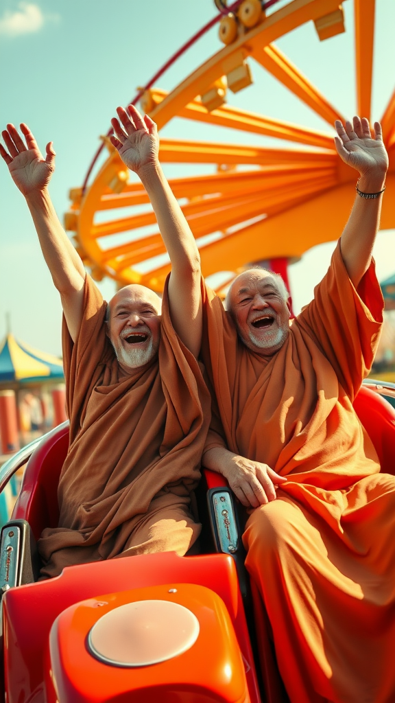 Two elderly zen monks clad in flowing zen robes sit side by side in a vibrant rollercoaster car, their arms joyfully stretched above their heads as they ride the loops and curves. Their faces are alight with pure laughter and joy, capturing a moment of youthful exuberance amidst the wisdom of age. The scene is set in an outdoor amusement park bathed in the dazzling light of a bright sunny day, with colorful attractions visible in the background. The composition adheres to the rule of thirds, with the monks positioned dynamically to emphasize movement and excitement. The cinematic lighting enhances the sense of wonder, while the action photography freezes this exhilarating moment, immortalizing their adventurous spirit.