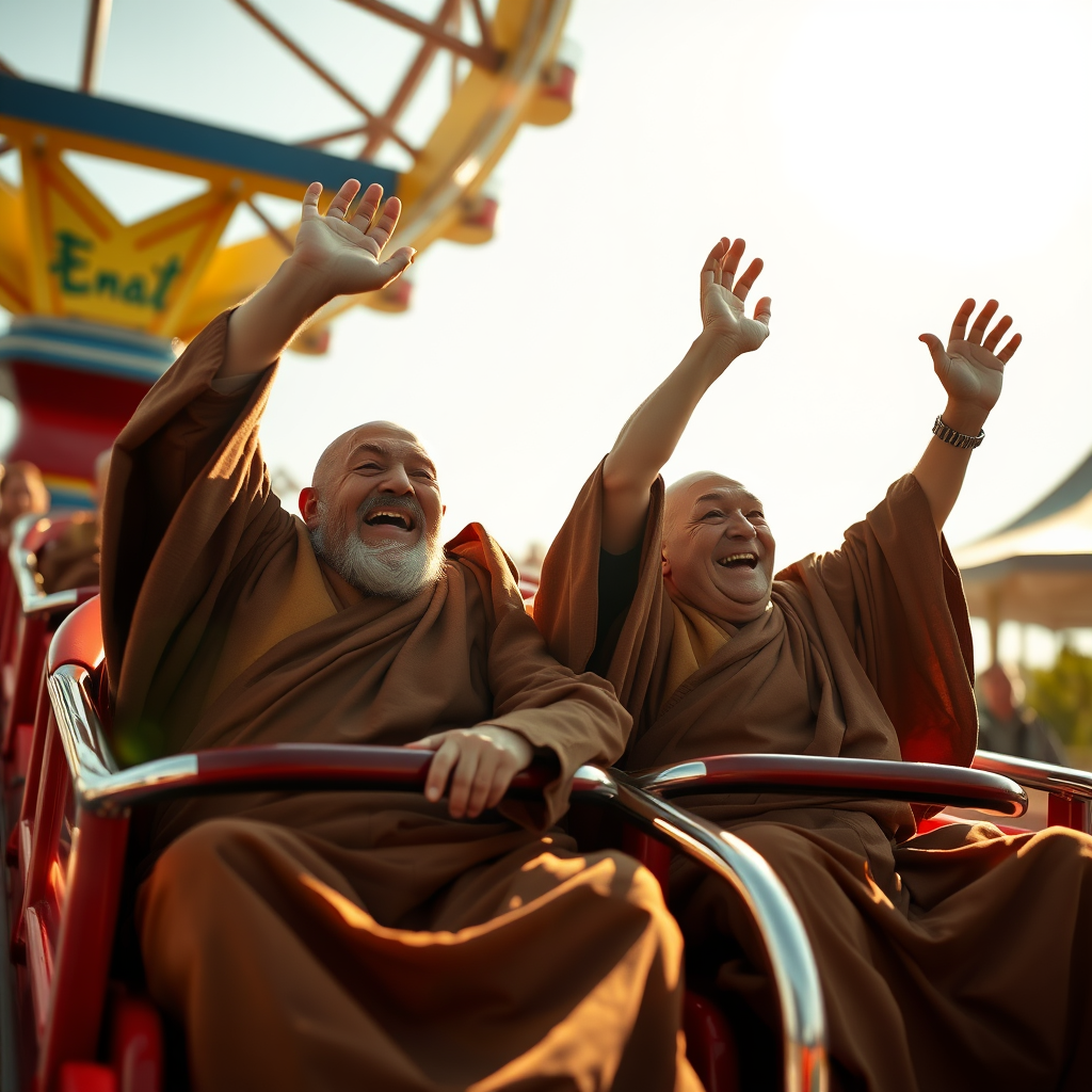 Two elderly zen monks in flowing robes are joyfully riding a rollercoaster, their arms playfully raised above their heads. Laughter fills the air as they embrace the thrill, surrounded by the brilliant sunshine of a perfect day. In an outdoor amusement park setting, a sense of wonder and childlike delight is captured. The scene feels cinematic, with dynamic action that exudes a contagious energy, perfectly framed as if under the rule of thirds, capturing the monks' animated expressions and the vibrant atmosphere.