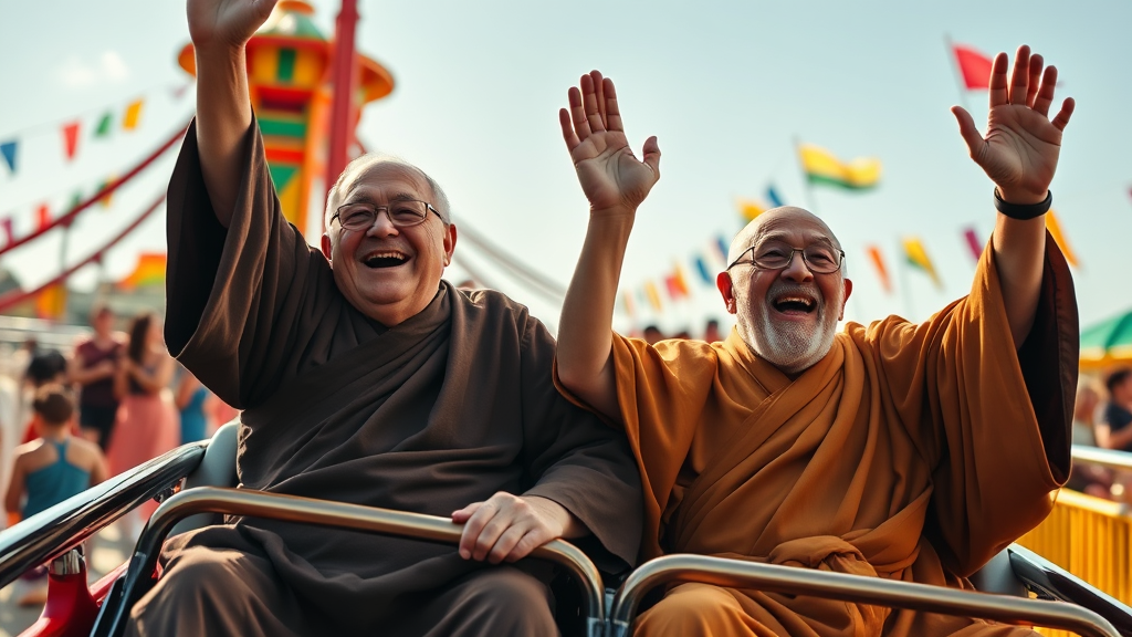 Two elderly zen monks in traditional robes joyfully riding a rollercoaster, their arms raised in exhilaration, laughter illuminating their faces. It's a bright, sunny day at a vibrant outdoor amusement park. The scene captures a sense of wonder and childlike delight, with cinematic lighting enhancing the moment. The composition follows the rule of thirds, creating a dynamic and balanced action photograph. In the background, colorful flags flutter in the breeze and cheerful onlookers share in the joy of the moment.
