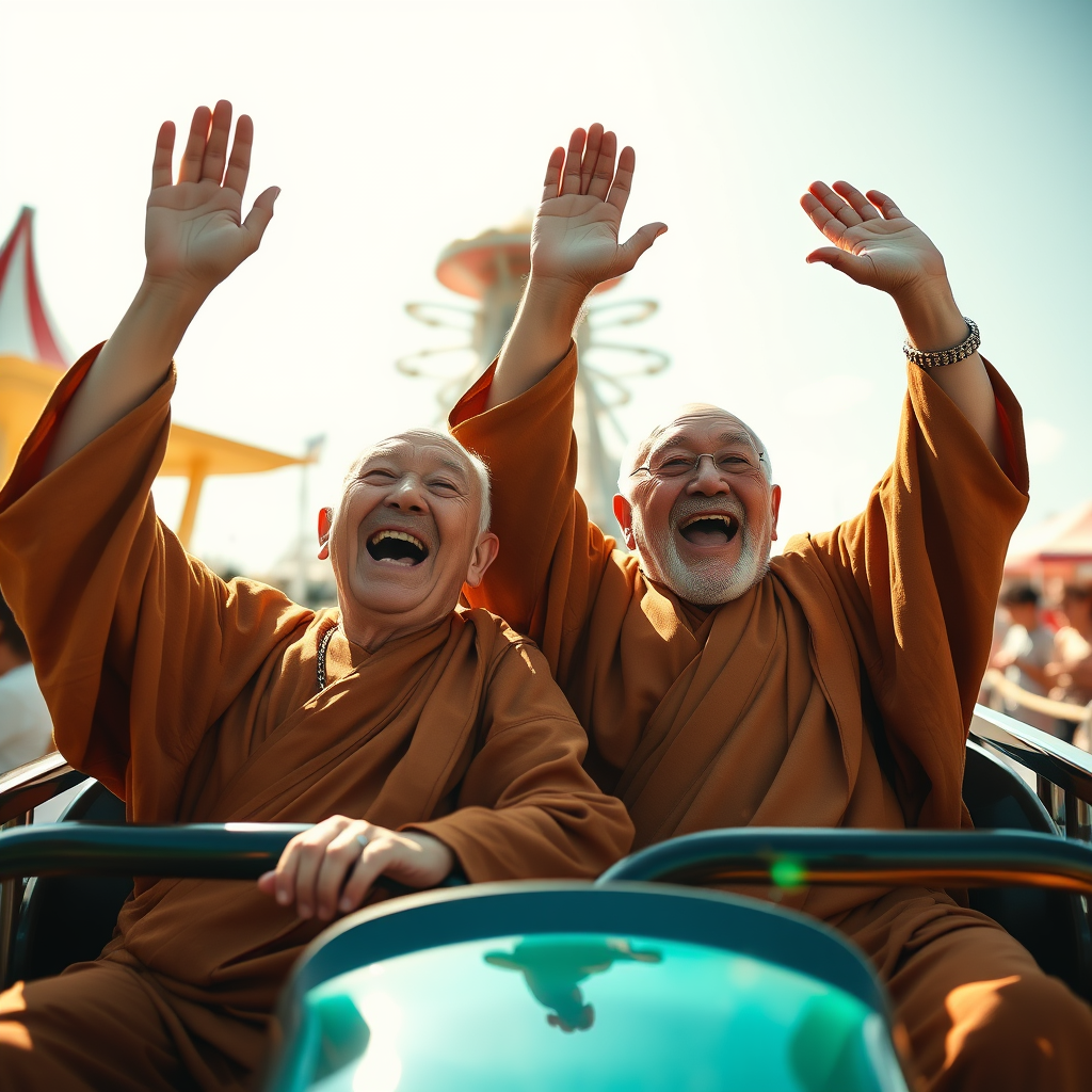 Two elderly zen monks in traditional robes joyfully experiencing a rollercoaster ride, their arms raised high in delight, expressions of pure bliss and laughter on their faces. The scene unfolds under a bright, sunny sky in a bustling outdoor amusement park. The vibrant day accentuates the monks' sense of wonder and excitement. Captured with cinematic lighting, with the sunlight casting dynamic shadows, the composition follows the rule of thirds, emphasizing the motion and energy of the moment in a lively, action-packed photograph.