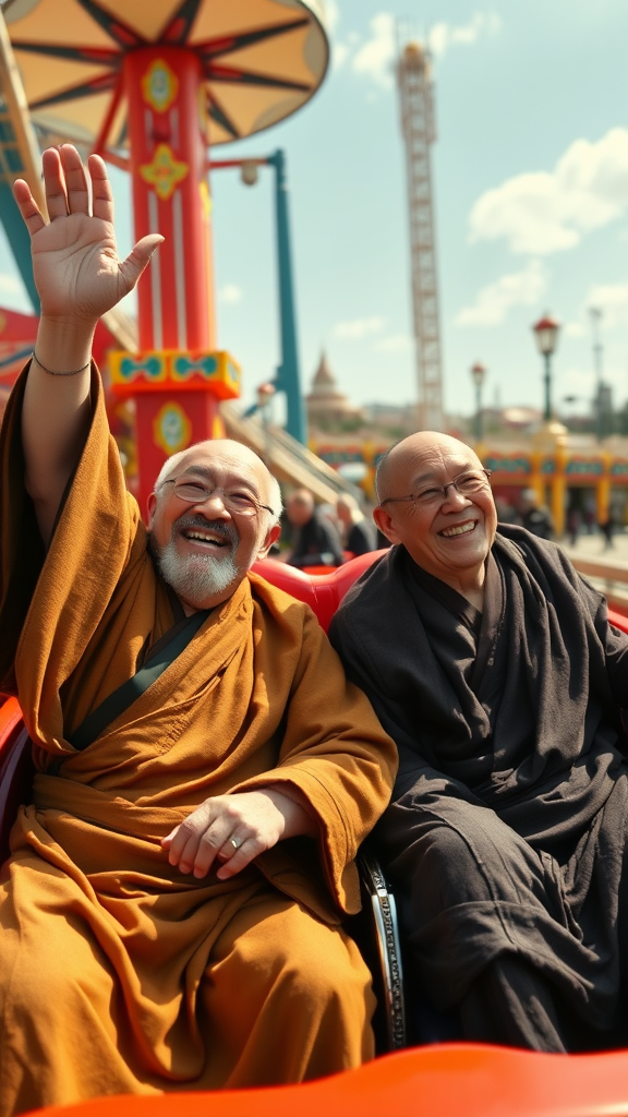 Two elderly Zen monks in traditional Zen robes enjoying a thrilling rollercoaster ride, their arms joyfully raised above their heads as they laugh heartily, encapsulating a sense of freedom and happiness. It's a bright, sunny day at the bustling outdoor amusement park, with vibrant colors and lively atmosphere. The scene captures a feeling of wonder and excitement, enhanced by cinematic lighting that adds depth and drama. The composition follows the rule of thirds, focusing on the action and expressions of the monks, blending the serenity of Zen with the exhilaration of the rollercoaster experience.