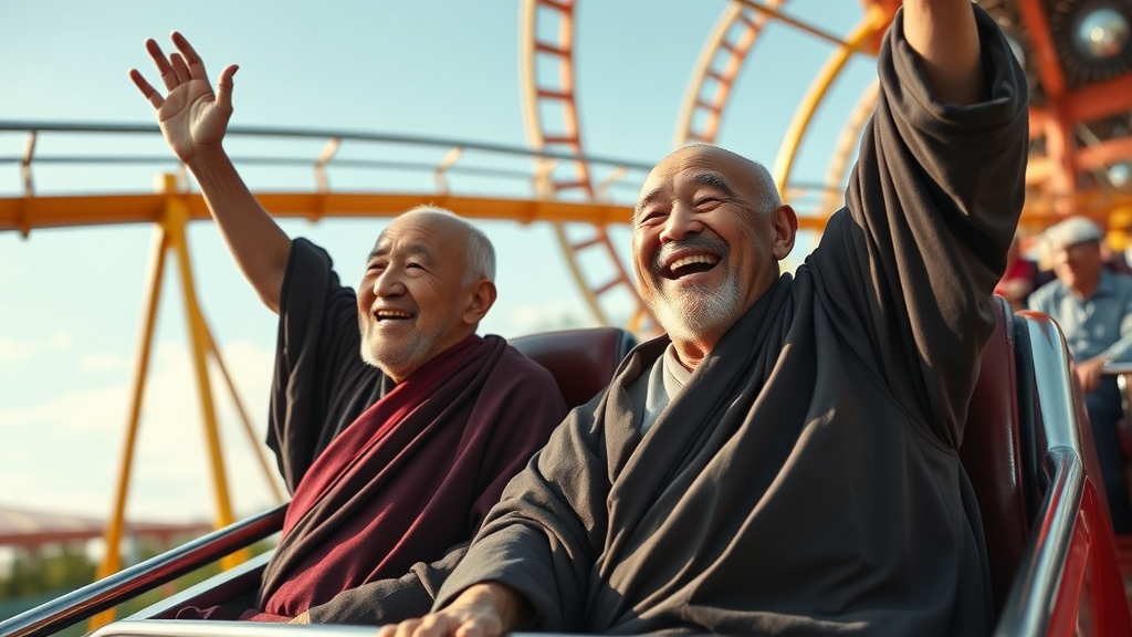 Two elderly zen monks in traditional zen robes enjoying a rollercoaster ride, their arms joyfully raised, faces lit with laughter and delight, bright sunny day at an outdoor amusement park, capturing a sense of wonder and serenity amidst the thrill, cinematic lighting highlighting their expressions, shot with rule of thirds composition, vibrant action photography, excitement and calmness perfectly balanced.