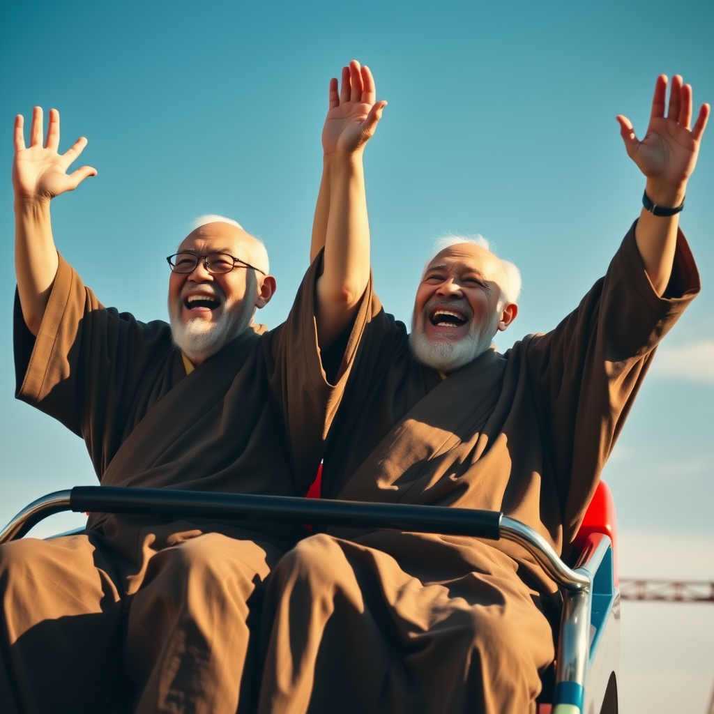 Two elderly Zen monks in traditional Zen robes joyfully ride a rollercoaster, their arms raised high in exhilaration as laughter fills the air. It's a vibrant, sunny day at an outdoor amusement park, with a backdrop of clear blue skies. The scene captures a sense of childlike wonder, with cinematic lighting that highlights the joyful expressions on their faces. The composition follows the rule of thirds, emphasizing the balance between the monks, the rollercoaster, and the scenic park surroundings. This action-packed moment is infused with the monks' peaceful yet adventurous spirits, creating a captivating contrast of serenity and excitement.