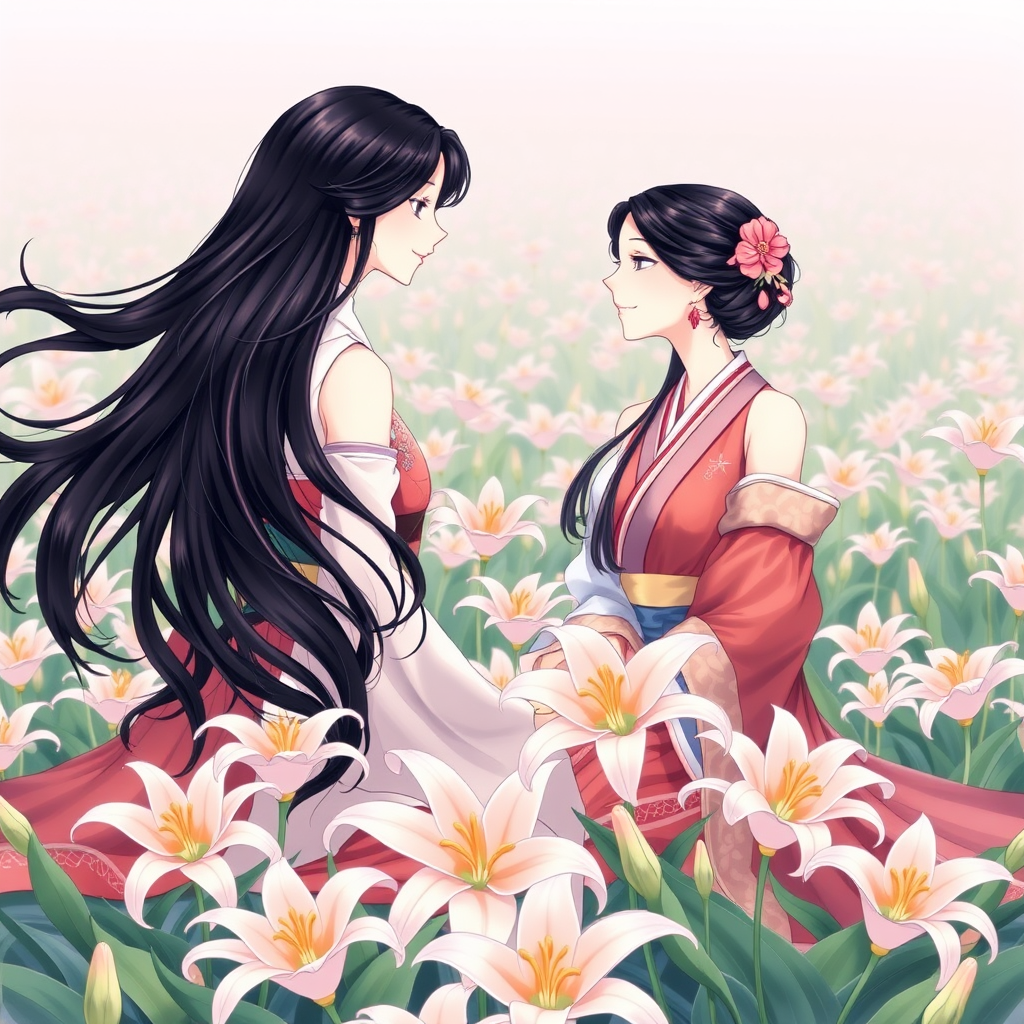 Two enchanting Japanese women with flowing jet black hair sit gracefully amidst a tranquil field of lilies, facing one another. Their captivating presence and gentle smiles complement the serene beauty of the blooms surrounding them.