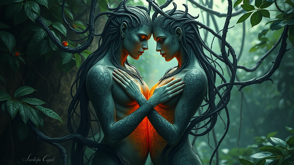Two ethereal figures embrace in the heart of the jungle, their forms seamlessly intertwined with lush vines, glowing with an otherworldly aura. Their detailed facial features reflect profound emotion, crafted from the earth's core essence. Dark, intricate patterns weave around their bodies, illuminated by a fiery core that pulses with life. The scene captures the mystical essence of nature, with a sense of eternal connection and harmony.