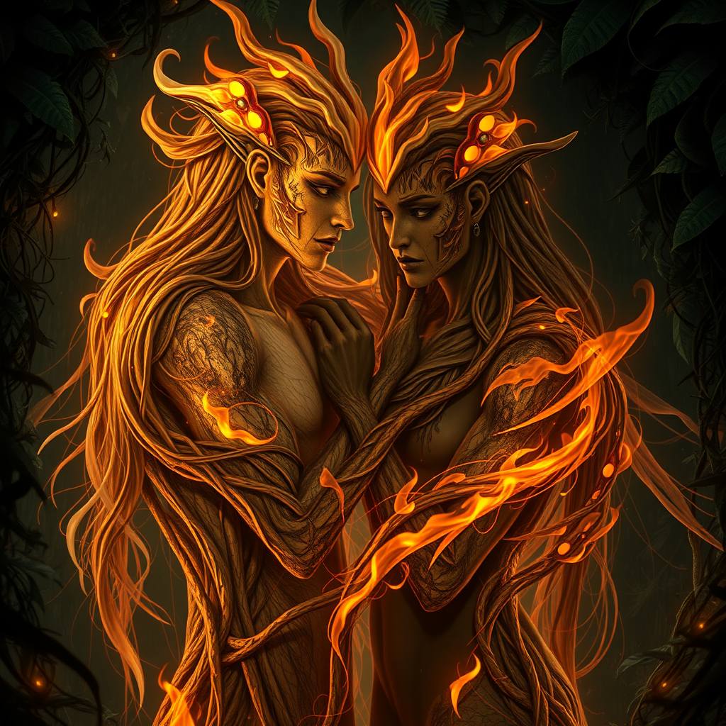 Two ethereal figures embracing in the heart of the jungle, their bodies seamlessly intertwined with vines, rendered with a hyper-realistic, physically based approach that highlights detailed facial features. Their forms are an intriguing fusion of earth and flame elements, evoking the essence of earthcore and firecore. The dark, intricate setting of the dense jungle envelops them, contrasting with their luminescent presence. The scene captures the mystique and harmony of nature and elemental forces with a highly stylized, almost otherworldly flair.
