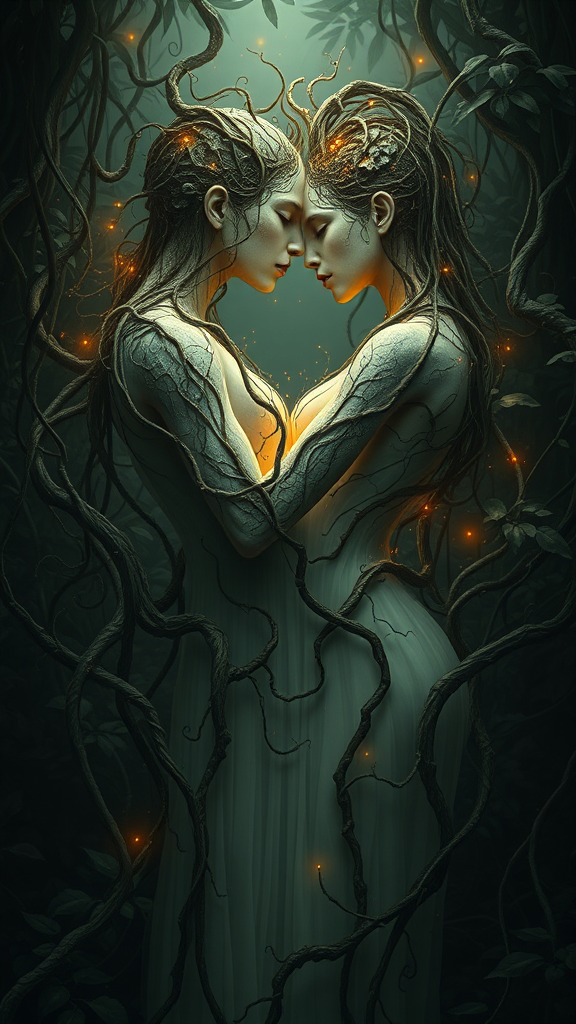 Two ethereal figures entwined in a heartfelt embrace amidst the dense jungle, their forms intricately composed of twisting vines and foliage, showcasing detailed facial features that appear to emerge from the earthcore. The scene is simultaneously grounded and otherworldly, with hints of firecore flickering through the vine textures, casting a warm, glowing undercurrent. The dark, intricate surroundings create a striking contrast against the luminous figures, evoking a sense of timeless connection and harmony with nature. The rendering is exceptionally detailed, highlighting the delicate interplay between light and shadow.