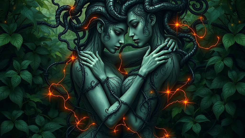 Two ethereal figures entwined in an embrace amidst a lush jungle, their forms intricately woven with flourishing vines. They possess detailed, expressive facial features that seem to radiate an inner luminescence. The setting is rooted in the essence of earthcore, enveloping the scene with a deep, natural intensity. Dark, intricate patterns course through their vine-like structures, intertwined with pulsating strands of firecore that shimmer with a warm, vibrant glow. This fusion of elements creates a mystical and harmonious unity within the verdant landscape.