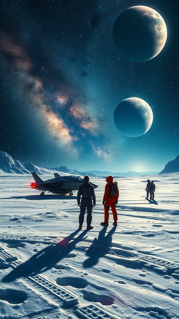 Two explorers stand amidst a landscape of shimmering ice, just beside their sleek spacecraft, their visors reflecting the vast tapestry of distant planets and twinkling stars that fill the sky. The icy moon's surface glows faintly under the starlight, with intricate patterns carved into the ground from meteor impacts and shifting ice. Above, the galaxy unfurls in a dazzling display of color and light, while a far-off gas giant looms majestically on the horizon. In this captivating science-fiction scene, every detail is rendered with stunning ultra-realism, immersing the viewer in the epic wonder of the cosmos.