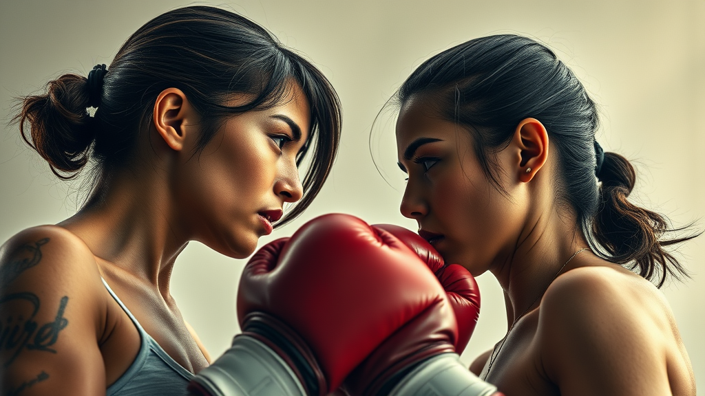 Two female boxers facing off in a dynamic boxing poster, showcasing intense expressions and a sense of rivalry. The scene is captured through high-resolution photography, emphasizing realistic and detailed skin textures. The image boasts a photorealistic quality with cinematic lighting and a shallow depth of field, ensuring sharp focus and an 8k resolution for intricate details. The composition is full-length, capturing the fighters in action within a CGI-enhanced setting. The soft diffused lighting highlights their features, maintaining a hyperrealistic portrayal against a minimalist background. Despite technical imperfections such as low resolution, text errors, and cropped elements, the focus remains on the powerful depiction of athleticism and determination. Avoid any unsightly qualities like deformed or mutated elements, ensuring an overall impression of balanced and proportional anatomy.