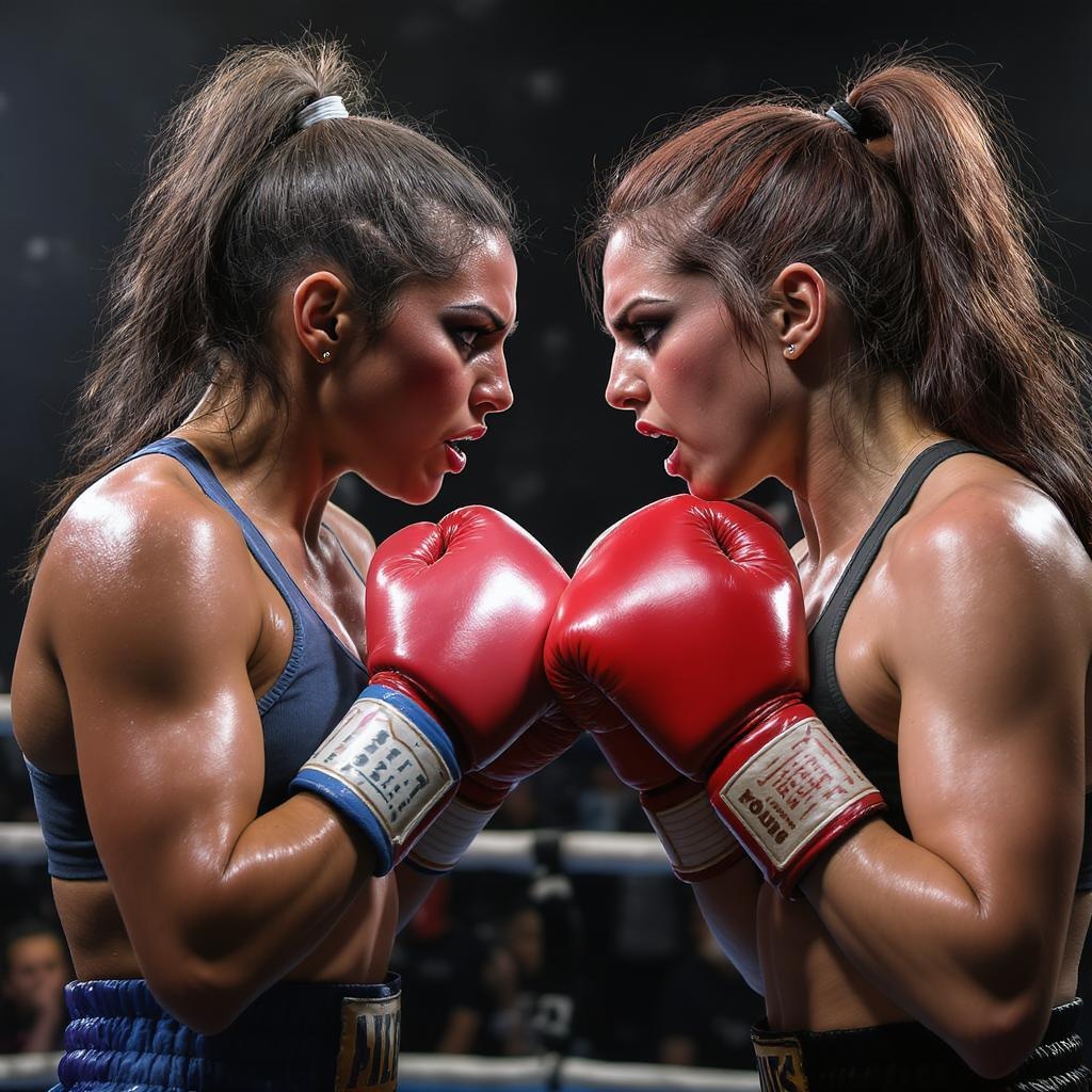 Two female boxers in a tense face-off, emotive expressions, intense boxing poster, fierce rivalry, detailed facial features, realistic, photo-realistic, full-length portrait, vibrant colors, soft diffused lighting, shallow depth of field, sharp focus, cinematic CGI lighting, hyperrealism, 3D rendering, high resolution, intricate skin texture, powerful stance, dynamic composition, capturing energy and motion, imperfect elements like jpeg artifacts, low quality errors, out-of-frame elements, distorted anatomy, unusual proportions, extra limbs, blended fingers, unusual neck lengths, and other subtle artistic imperfections.