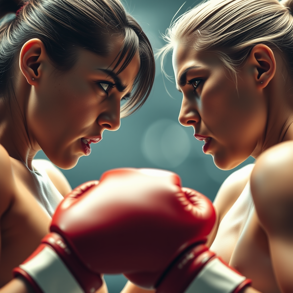 Two fierce female boxers facing off in a high-energy showdown, captured in a photographic style. Their expressions are intense and filled with determination. The scene is set in an 8k ultra-realistic resolution, emphasizing every pore and detail of their skin, highlighted by soft, diffused lighting. The composition is a full-length frame, showcasing the strength and athleticism of both fighters. The lighting is cinematic, creating a dramatic atmosphere, with a shallow depth of field and sharp clarity that emphasizes the hyperrealism of the image. The CGI elements give it a 3D feel, enhancing the viewers' experience. Despite the dynamic motion and realism, the image has a touch of imperfection with some subtle artifacts and intentional blurring to convey a sense of raw, unrefined action.