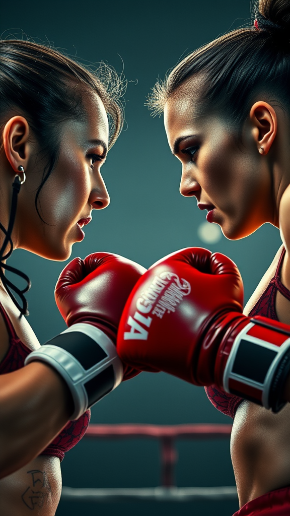 Two fierce female competitors facing off in a boxing match, depicted on a poster with a versus theme, both showing intense determination and anger, captured in a highly detailed and realistic photographic style. The image features full-length profiles with incredibly detailed skin textures and dynamic poses, all rendered in 8k resolution with high detail. The scene benefits from diffused soft lighting and a shallow depth of field, ensuring sharp focus on the subjects in a hyperrealistic manner. The cinematic lighting is reminiscent of CGI, providing a striking 3D appearance. The background is free of distractions and imperfections, maintaining a polished and professional look, highlighting the athletic prowess and intensity of the confrontation, without any distorted or exaggerated features.