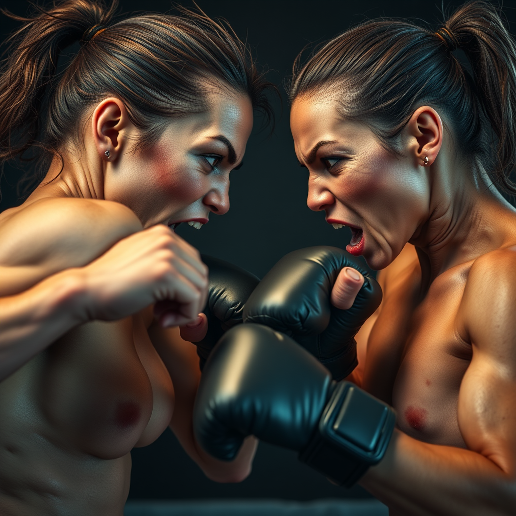Two fierce females, boxing match, intense showdown, fierce expressions, photography, intricate skin texture, lifelike, ultra-realistic, 8k resolution, highly defined, full body view, high detail RAW color artistry, diffused soft lighting, shallow depth of field, precise focus, hyperrealism, cinematic lighting CGI, 3d rendering, low resolution, text, error, cropped, poor quality, jpeg artifacts, unattractive, duplicate, grotesque, disfigured, out of frame, extra fingers, mutated hands, poorly drawn hands, poorly drawn faces, mutation, deformed, blurry, dehydrated, flawed anatomy, disproportionate, extra limbs, cloned face, distorted, awkward proportions, malformed limbs, missing appendages, fused fingers, excessive fingers, unusually long neck, username, watermark, signature.