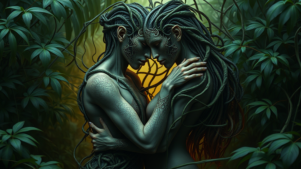 Two figures entwined in a deep embrace amidst the jungle, their forms ethereal and composed of intertwining vines, with intricate, detailed facial features that reveal an earthcore essence. Their presence exudes a dark and complex vitality, illuminated by a firecore glow. The scene is rendered with a physically based approach, capturing the dense, verdant surroundings in stunning detail.