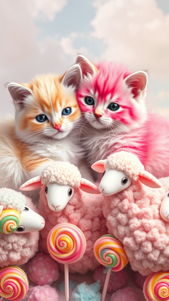 Two fluffy kittens nestled beside one another, depicted in a soft pastel style reminiscent of Christen Kobke's work, with a rococo touch. Surrounding them is a whimsical scene featuring rainbow sheep, their wool as vibrant as cotton candy, seemingly crafted from sugar and adorned with lollipops, creating a fantastical landscape that blurs the line between dream and reality.
