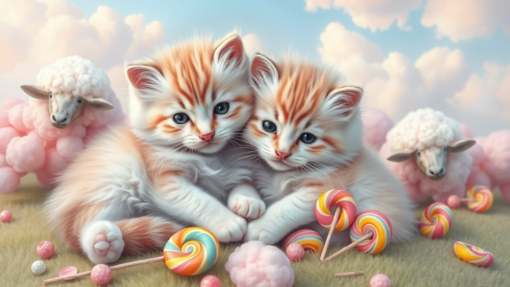 Two fluffy kittens nestled beside one another, their fur soft and pastel-hued, evoking the gentle charm of a Christen Kobke painting. They are surrounded by a whimsical rococo scene where rainbow-hued sheep, resembling clouds of cotton candy, playfully roam. The landscape is adorned with fantastical elements made of candy and lollipops, adding a touch of dreamy sweetness to the idyllic setting.