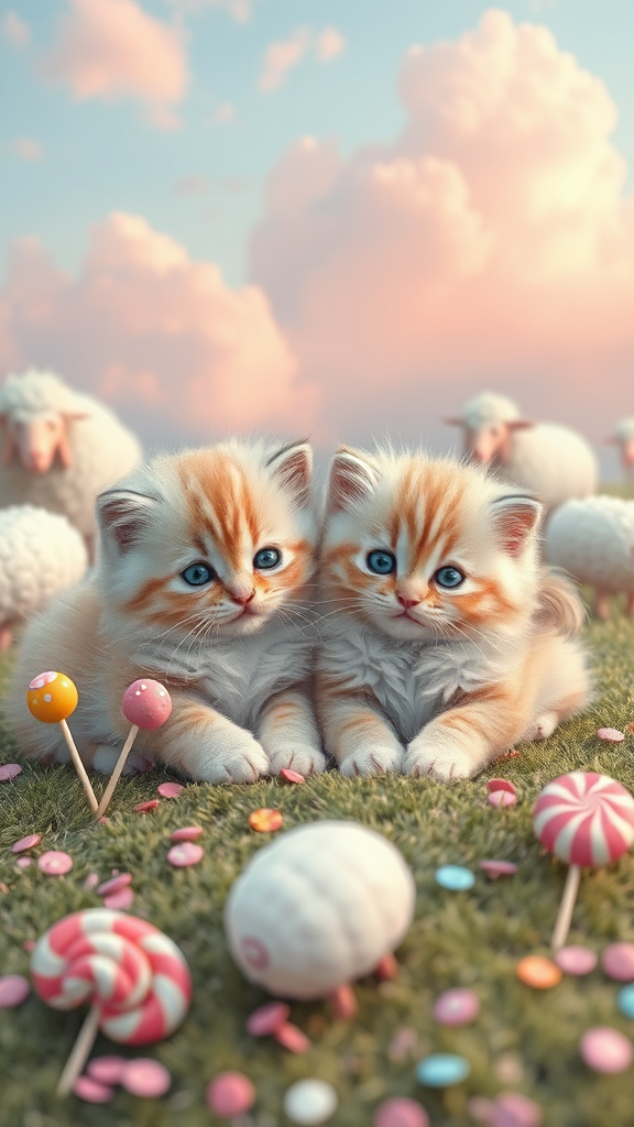 Two fluffy kittens nestled side by side amid a dreamy landscape, in a pastel style reminiscent of Christen Kobke's delicate touch. The scene is enhanced with a whimsical rococo flair, where rainbow-hued sheep meander like cotton candy clouds. The fantastical setting is further adorned with vibrant candies and lollipops, creating a sweet and enchanting tableau that merges charm and whimsy.