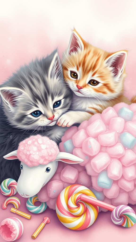 Two fluffy kittens nestled together, illustrated in pastel tones by Christen Kobke; this whimsical scene evokes a rococo aesthetic with its intricate details. Surrounding them, a rainbow-colored sheep reminiscent of cotton candy lounges nearby, its wool composed of shimmering candy and swirling lollipops, creating a fantastical and sweetly vibrant landscape.