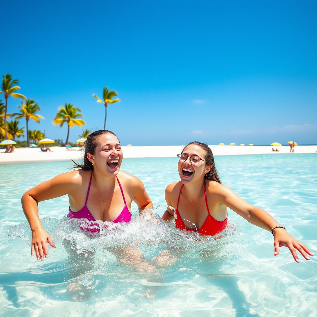 Two friends splashing and laughing in the shallow waters of a sunlit tropical beach. Brightly colored beach towels and umbrellas dot the sandy shoreline behind them, while palm trees sway gently in the warm breeze. The turquoise water glistens under the clear blue sky, creating a vibrant and joyful atmosphere. Their carefree movements send droplets sparkling in the sunlight, embodying the essence of a perfect beach day.