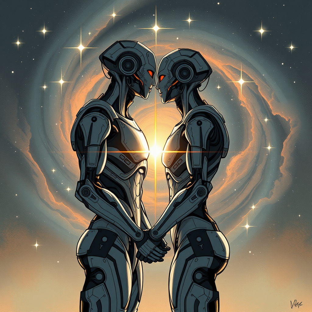Two futuristic cyborgs sharing a tender kiss, poised at the precipice of the cosmos, framed symmetrically against a swirling nebula, interspersed with bright, shimmering stars, embodying the elegance of the golden ratio, rendered in a dynamic concept art style that blends rough sketches with intricate detail.