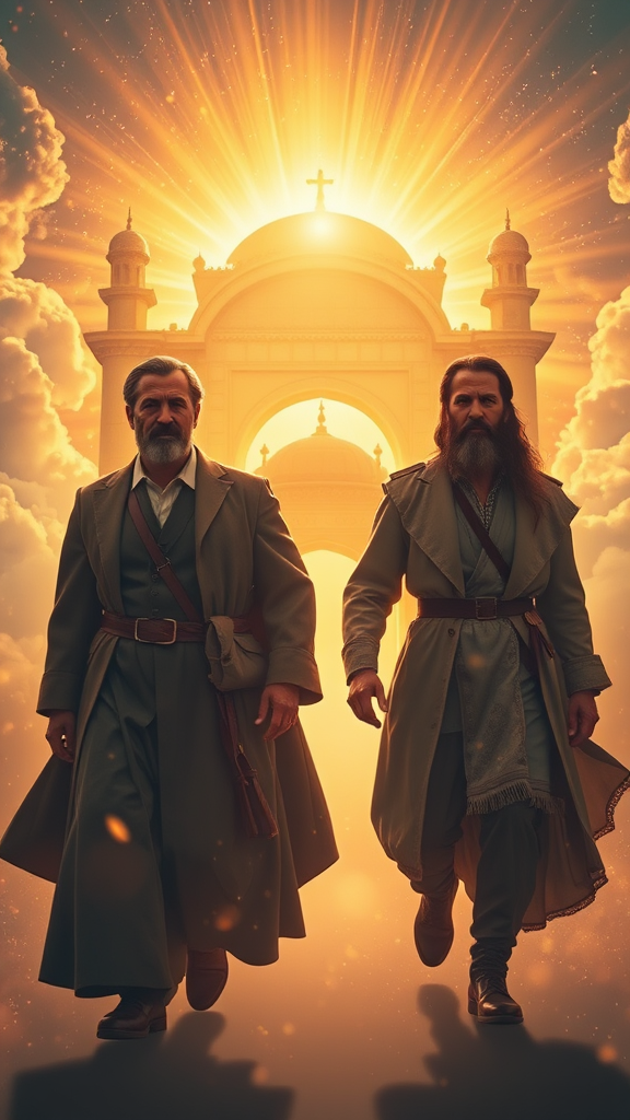 Two iconic historical figures stride towards a radiant, celestial gateway, their silhouettes bathed in a shimmering golden glow that embodies a journey transcending time. The scene is set in an ethereal environment, where elements of Ottoman grandeur blend seamlessly with the austere elegance of early Republican architecture, all suspended amidst the clouds. The gateway looms majestically in the backdrop, a beacon of heavenly light. Each figure exudes lifelike expressions and wears clothing rendered with historical accuracy, their faces captured with ultra-detailed precision. The air around them is charged with a divine energy, as misty golden light casts a serene yet powerful ambiance. They are enveloped in a mystical aura, with gentle, glowing particles drifting through the air, creating an atmosphere that is both cinematic and hyperrealistic. The intricate details of their garments are illuminated, enhancing the epic and inspiring composition that evokes a profound sense of honor and transcendence.