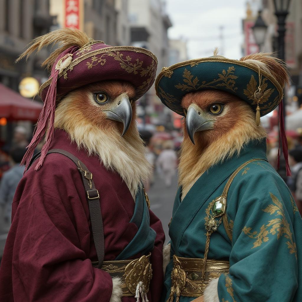 Two individuals adorned in intricate cloth hats and flowing robes, captured in the style of lifelike animal portraits, infused with the aesthetic of neo-renaissance art and rendered with the advanced detail of unreal engine; their attire features a harmonious blend of maroon and emerald, evoking an avian-inspired theme. They are set against the backdrop of a bustling cityscape, exuding the charm and charisma of captivating characters, with slight artistic modifications enhancing the overall composition.