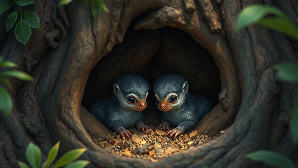 Two infant creatures nestled in the hollows of ancient trees, depicted with hyperrealistic attention to detail, inspired by avian-themed wildlife portraits, blending the styles of Stephen Shortridge, Lilia Alvarado, and Bob Eggleton. The scene captures intricate wildlife and delicate nature studies, with a focus on natural textures and vibrant foliage, embodied in a raw artistic style, highlighting the enchanting interplay of light and shadow within the forest habitat.