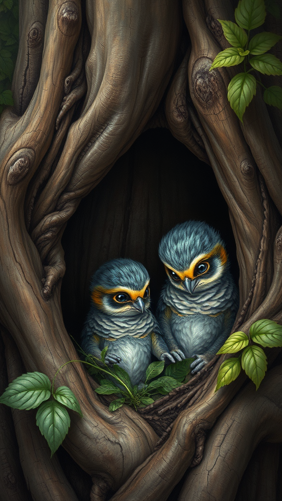 Two infant creatures nestled within the hollows of ancient trees, in a style reminiscent of hyperrealistic wildlife portraits, with a focus on avian elements, inspired by the works of Stephen Shortridge, Lilia Alvarado, and Bob Eggleton. Detailed studies of nature featuring intricate feather patterns and vibrant foliage, capturing the essence of a serene and timeless forest habitat, with a whimsical yet realistic narrative woven into the portrait, emphasizing the harmonious coexistence of art and the natural world.