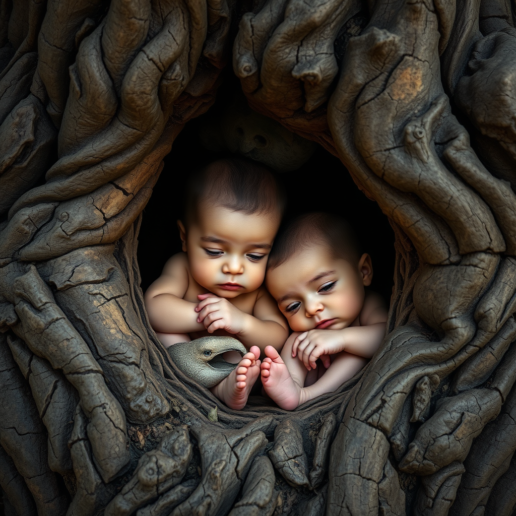 Two infants nestled in the embrace of ancient tree hollows, captured in the style of hyperrealistic wildlife portraits. Their surroundings are avian-themed, echoing the intricate artistry of Stephen Shortridge, the emotive storytelling of Lilia Alvarado, and the detailed world-building reminiscent of Bob Eggleton. The scene is a delicate balance between wildlife study and artistic expression, capturing the essence of nature's wonders. Their innocent expressions are framed by rich textures of bark and foliage, embodying the harmony of nature's cradle in a raw and vivid depiction.