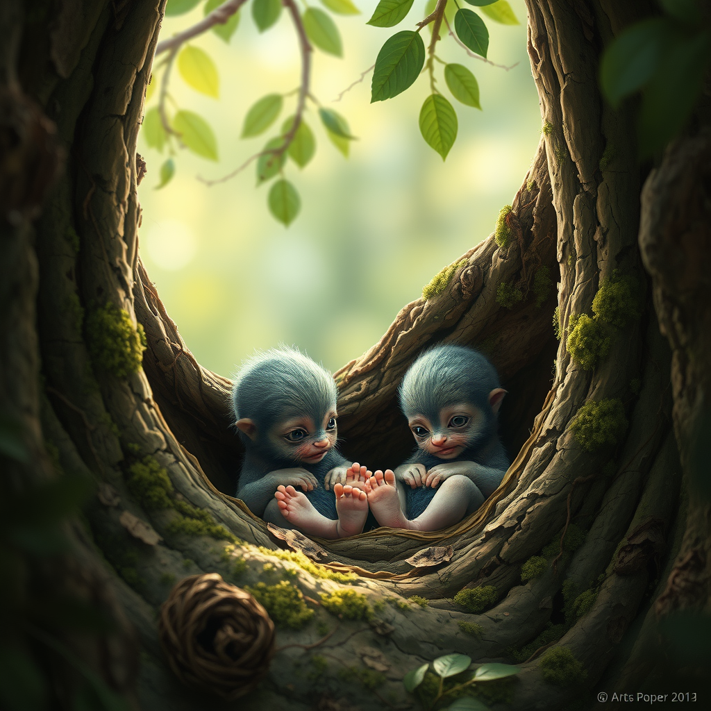 Two infants nestled within the hollows of ancient trees, depicted in ultra-realistic wildlife portrait style, inspired by avian themes, echoing the brushstrokes of Stephen Shortridge, the lens of Lilia Alvarado, and the imaginative flair of Bob Eggleton. Detailed studies of nature with intricate textures and colors, capturing the essence of serene wilderness and delicate life. Set against lush, verdant backgrounds, with the play of light and shadow adding depth. At the intersection of raw, untamed beauty and sophisticated artistry --ar 53:89 --q 2 --s 750 --style raw.