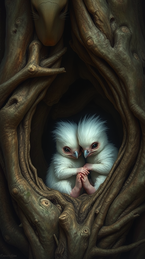 Two infants nestled within the hollows of ancient trees, depicted in the style of hyperrealistic wildlife portraits with a graceful avian theme. The scene captures the intricate details reminiscent of the works of Stephen Shortridge and Lilia Alvarado, blended with a touch of Bob Eggleton's imaginative essence. Each texture of the bark and the delicate feathers are presented with meticulous attention to detail, embodying the essence of detailed wildlife and nature studies. The infants' surroundings are lush, vibrant with the life of the forest, captured in its raw and unfiltered beauty.