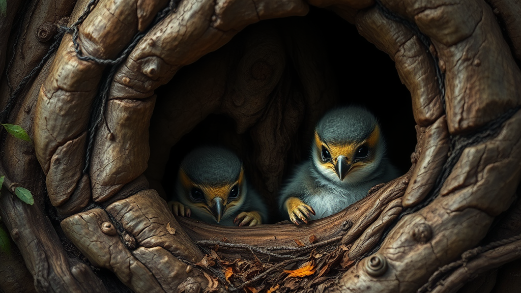 Two infants nestled within the hollows of ancient trees, captured in hyperrealistic wildlife portrait style, inspired by avian themes. Their surroundings echo the artistic nuances of Stephen Shortridge, Lilia Alvarado, and Bob Eggleton, combined to create detailed studies of nature. The scene is vividly detailed, emphasizing intricate textures of bark and feathers, with a focus on the raw essence of wildlife and the serene harmony of the natural world. The artwork conveys a sense of wonder and discovery, captured with a unique artistic perspective that invites viewers into this secretive woodland sanctuary.