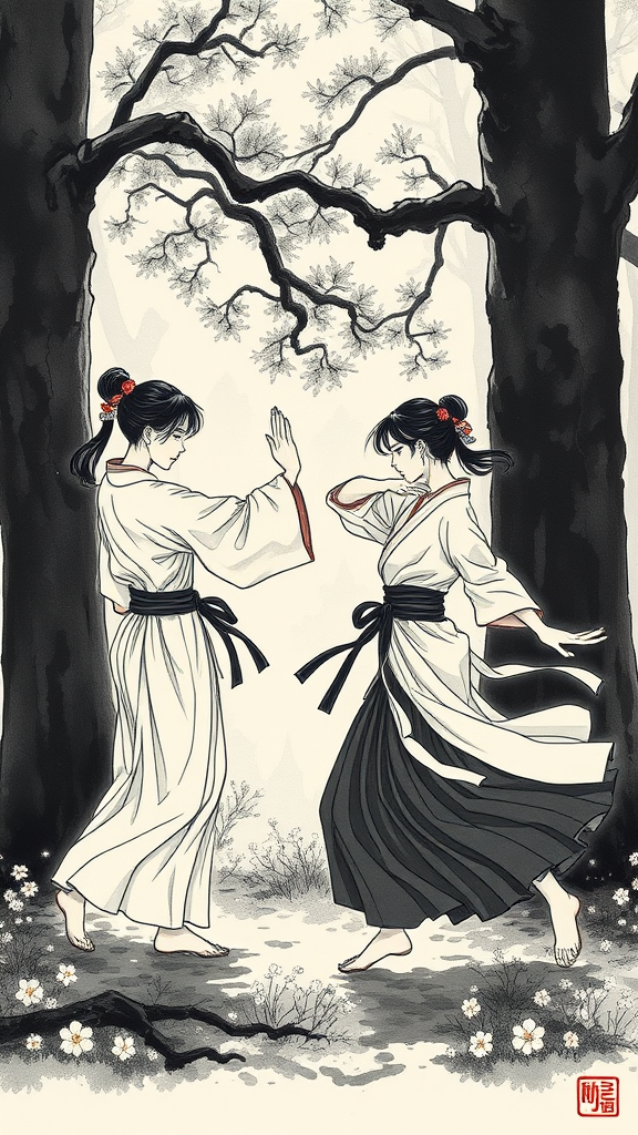 Two Japanese women gracefully engaged in a karate duel amidst a tranquil forest, depicted in the style of traditional Japanese ink painting. They are dressed in flowing, traditional attire, with the movement capturing the elegance and intensity of their martial art. Sunlight filters through the trees, casting dappled shadows on the forest floor, adding a serene ambiance to the dynamic scene. The ink strokes emphasize both the fluidity and precision of their movements, blending harmony and strength against a backdrop of towering ancient trees and delicate wildflowers.