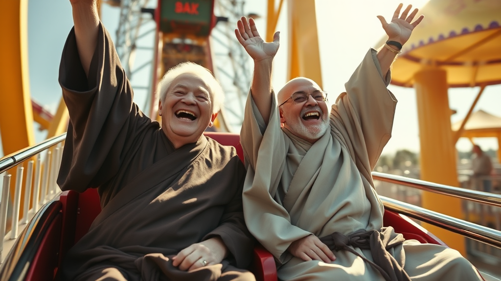 Two joyful elderly zen monks in graceful zen robes, seated on a thrilling rollercoaster, their arms joyously raised above their heads and faces beaming with laughter, in the midst of a bright, sun-drenched day at a lively outdoor amusement park. The scene captures a sense of childlike wonder and adventure, with cinematic lighting enhancing the moment. The composition follows the rule of thirds, emphasizing their playful spirits amidst the dynamic action of the ride.
