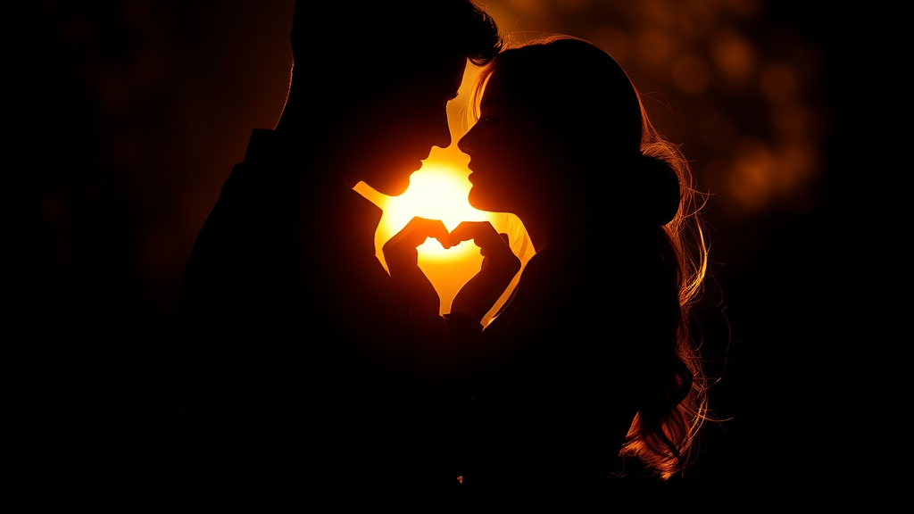 Two lovers locked in a tender embrace, their silhouettes softly highlighted by a radiant, amber light, forming the shape of a heart.