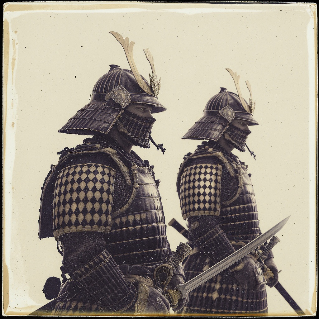 Two samurai in intricately detailed armor pose against a monochrome backdrop, emulating the style of classic staged portraits, their silhouettes captured in a vintage sepia-toned aesthetic. The image exudes an ultra-high-definition quality, where dark indigo and silver hues blend seamlessly into a neo-mosaic pattern reminiscent of historical wet plate photography. The scene is imbued with subtle, edgy political undertones, hinting at a deeper narrative within the meticulously crafted details, capturing a moment frozen in time.