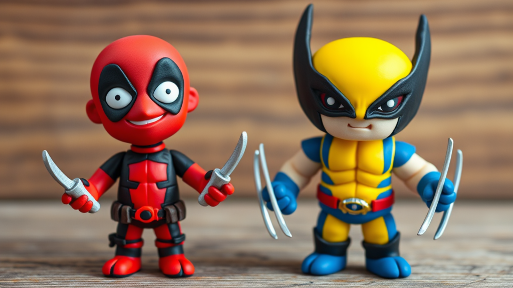 Two vibrant plasticine figures of Deadpool and Wolverine, crafted from colorful clay, stand side by side. Deadpool is styled in his signature red and black suit, with exaggerated, cartoonish features and a cheeky grin, brandishing two tiny, clay katanas. Beside him, Wolverine is depicted in his classic yellow and blue attire, sporting clay claws extended from clenched fists and a determined look on his face. Their playful, handmade appearance is enhanced by a simple backdrop—perhaps a textured wooden surface or a whimsical claymation-style setting—bringing their dynamic personalities to life.