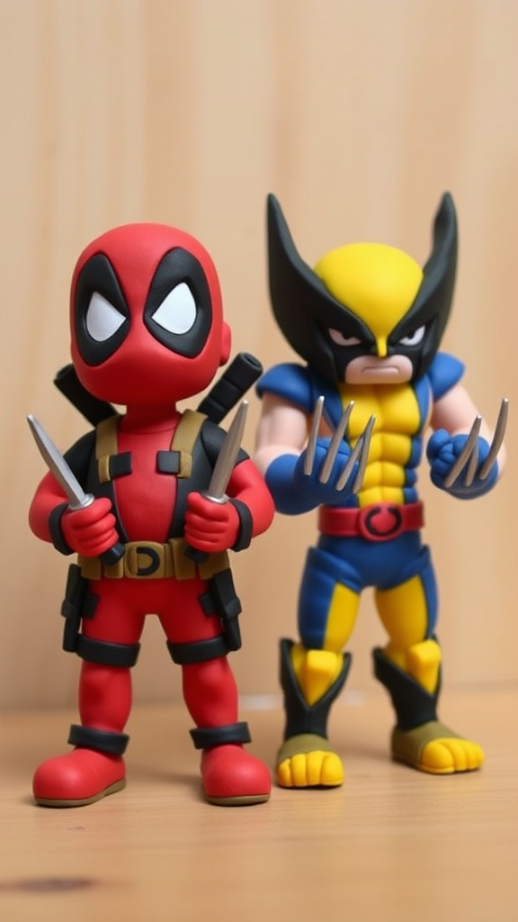 Two vibrant plasticine figures of Deadpool and Wolverine stand proudly, crafted with bold, colorful clay. Deadpool is showcased in his signature red and black suit, with an exaggerated, cartoonish design, exuding his trademark mischievous grin. In his hands are two small, clay katanas, poised for playful antics. Beside him, Wolverine is depicted in his iconic yellow and blue ensemble, with meticulously sculpted clay claws extending from his fists. His expression is stern, capturing his fierce demeanor. The figures are placed against a simple backdrop, perhaps a wooden surface or a whimsically crafted claymation-style setting, enhancing the homemade, plasticine charm of the scene, with slight creative flourishes aiming to boost the dynamic interaction between these iconic characters.