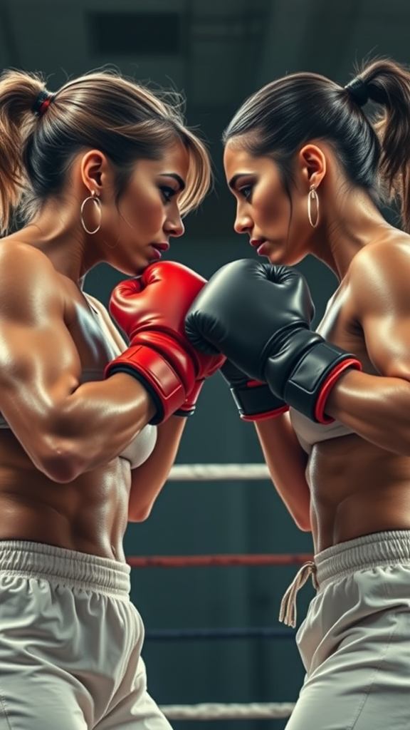 Two women, boxing match, intense face-off, photography, lifelike skin texture, ultra-realistic, high-resolution, full-length composition, vibrant RAW color depiction, soft lighting, shallow depth of field, crisp focus, cinematic CGI lighting, 3D effect, text elements present, image artifacts, cropped appearance, improving quality with natural proportions, maintaining correct anatomy, realistic proportions, clear focus on figures, correct limb count, lifelike expressions, balanced composition, avoiding excessive alterations, ensuring integrity of features, artistic representation without digital errors, clean and professional finish.