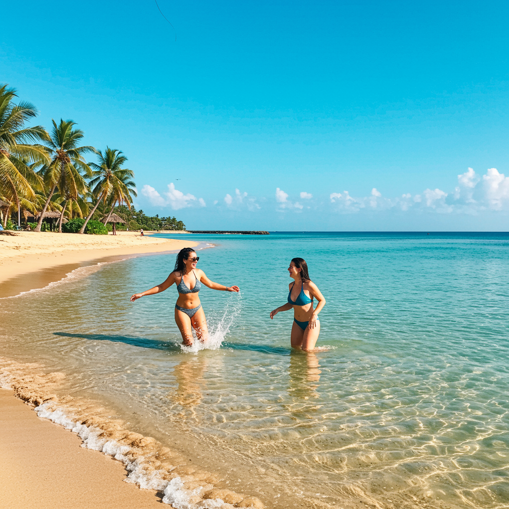 Two women enjoying themselves in the shallow waters of a sun-drenched tropical beach. The vibrant blue sky and gentle waves create a serene backdrop as the women splash and laugh, their carefree spirit evident. The golden sand and lush palm trees frame the scene, embodying a perfect tropical paradise.