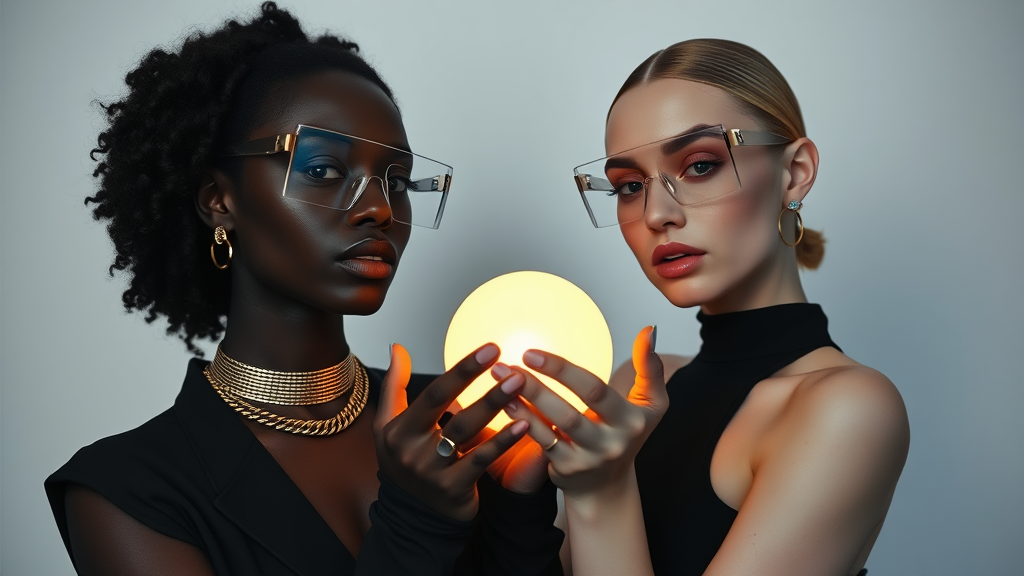 Two women, one with ebony skin and the other with alabaster, adorned in elegant gold jewelry, strike a graceful pose against a soft matte white backdrop. A thick, neon transparent band of unconventional eyewear spans their eyes, accentuating their sleek black ensembles. This scene embodies modern minimalism and avant-garde style, exuding the sophistication and artistic flair of a futuristic 2066 Vogue magazine shoot. In their gently cupped hands rests a glowing orb, illuminating the dim setting with a serene, mystical warmth.
