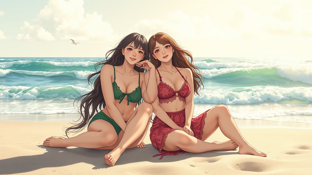 Two women sitting and playfully engaging with the photographer on a sunlit beach, the ocean waves creating a serene backdrop. Both women are the focal point of the scene, exuding intricate and captivating beauty. The artwork is characterized by precise linework and vibrant colors, capturing a cinematic and detailed aesthetic reminiscent of Avetetsuya Studios and the style of anime and manga. Despite a low-resolution appearance, the image avoids common artistic flaws like missing or extra digits, awkward anatomy, or poor framing. The focus remains on expressing beauty and connection, unhindered by visual distractions such as watermarks or other imperfections.