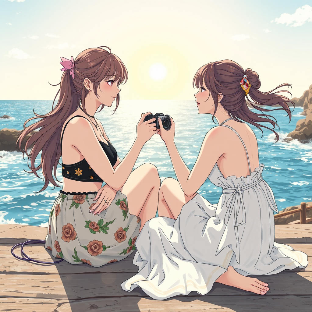 Two women sitting playfully interacting with the photographer at the seaside, on a sunlit day with the ocean as the backdrop. Centered composition highlighting the key visual elements. The scene is intricately detailed, capturing breathtaking beauty with precise linework. Vibrant colors and a comprehensive cinematic style evoke the charm of Avetetsuya Studios. Inspired by anime and manga aesthetics, akin to the style of Genshin Impact. Low resolution with artistic imperfections such as error-prone text, uneven finger count, cropped composition, jpeg artifacts, occasional signature marks, and anatomy variations. Expect quirky features like extra limbs or digits, disfigured forms, and imaginative distortions, offering a unique and surreal visual narrative.